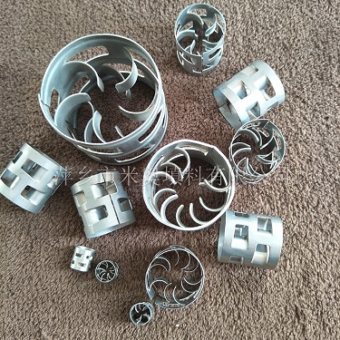 金屬鮑爾環(huán)填料是20世紀40年代德國BASF公司在拉西環(huán)填料的基礎(chǔ)上開發(fā)的,它采用金屬薄板沖扎制成,在環(huán)壁上開出了兩排帶有內(nèi)伸舌葉的窗孔,每排窗有五個舌葉彎入環(huán)內(nèi),指向環(huán)心,在中心處幾乎相搭,上下兩層窗孔的位置相互錯開,一般開孔的總面積約為整個環(huán)面積的35%左右。由于在環(huán)壁上開了許多窗孔,使得填料層內(nèi)的氣、液分布情況及傳質(zhì)性能比拉西環(huán)有較大的改善。金屬鮑爾環(huán)填料層內(nèi)的氣體和液體分布較之拉西環(huán)有較大的改善,尤其是填料環(huán)內(nèi)表面容易被液體潤濕,使得內(nèi)表面得以充分利用。同種材質(zhì)、同樣規(guī)格的鮑爾環(huán)填料,較之拉西環(huán)不但具有較大的通過能力和較低的壓降,而且使塔的分離效率有所提高,操作彈性也有所增大。廣泛應(yīng)用于石油化工、化肥、環(huán)保等行業(yè)的填料塔中。